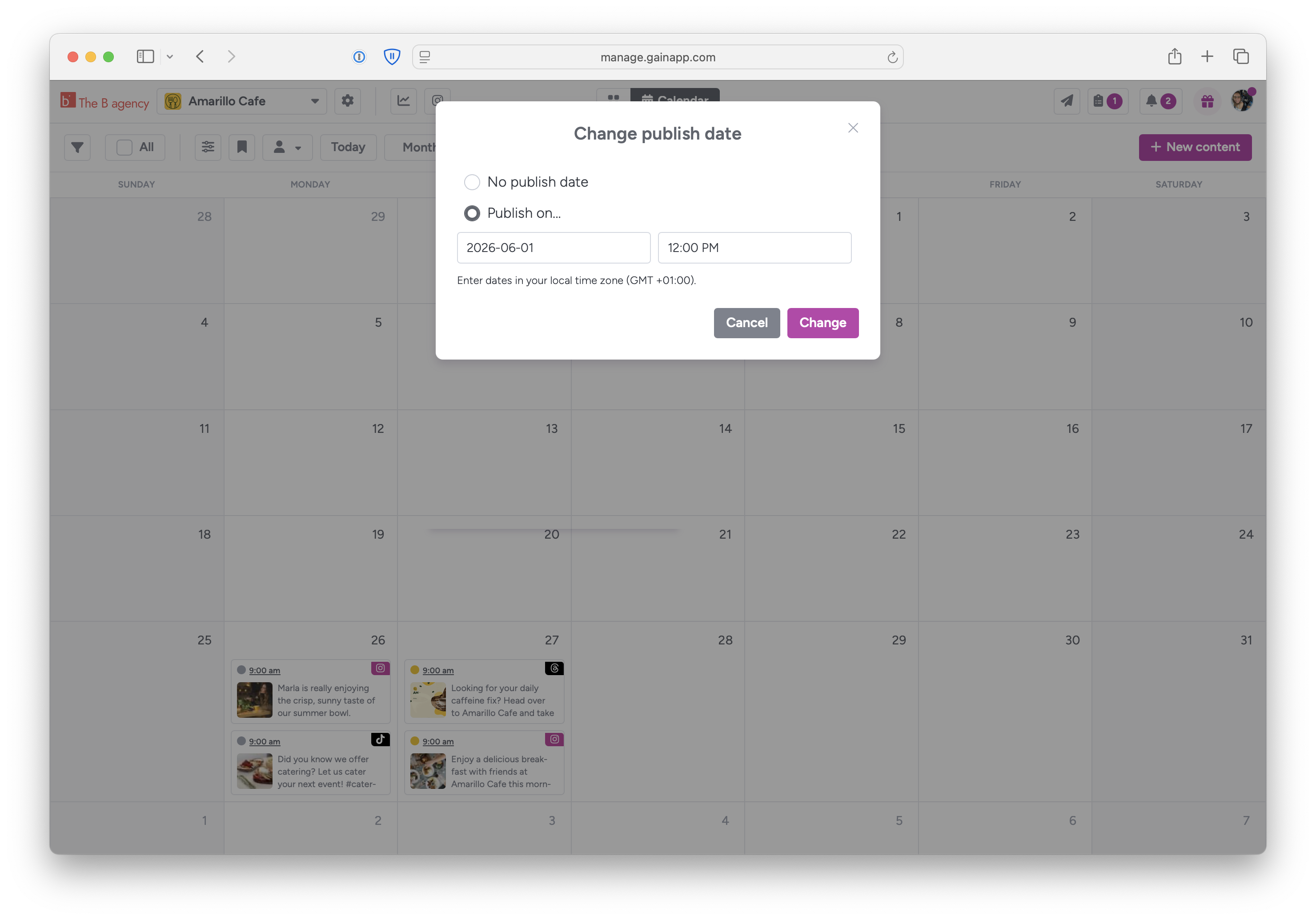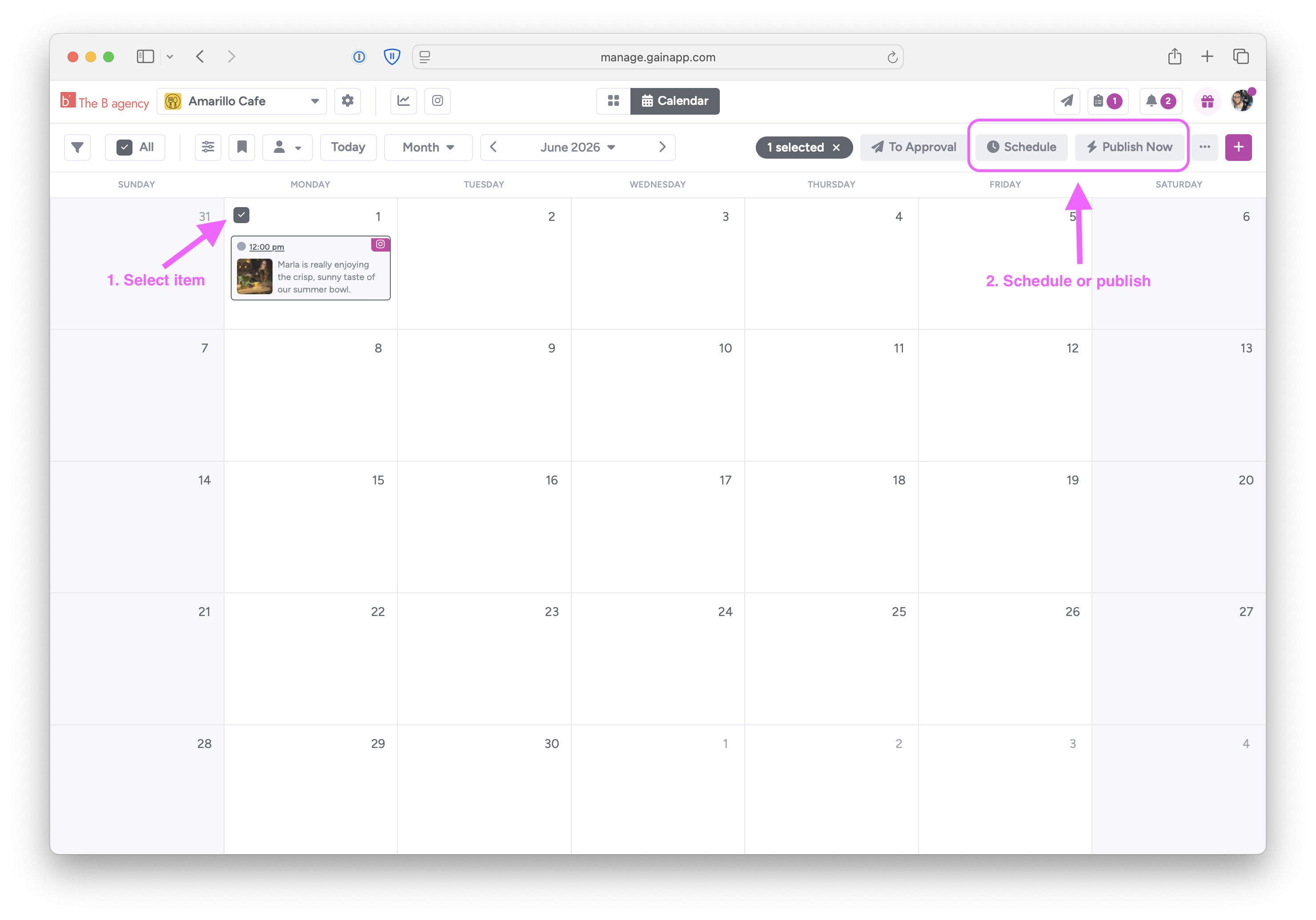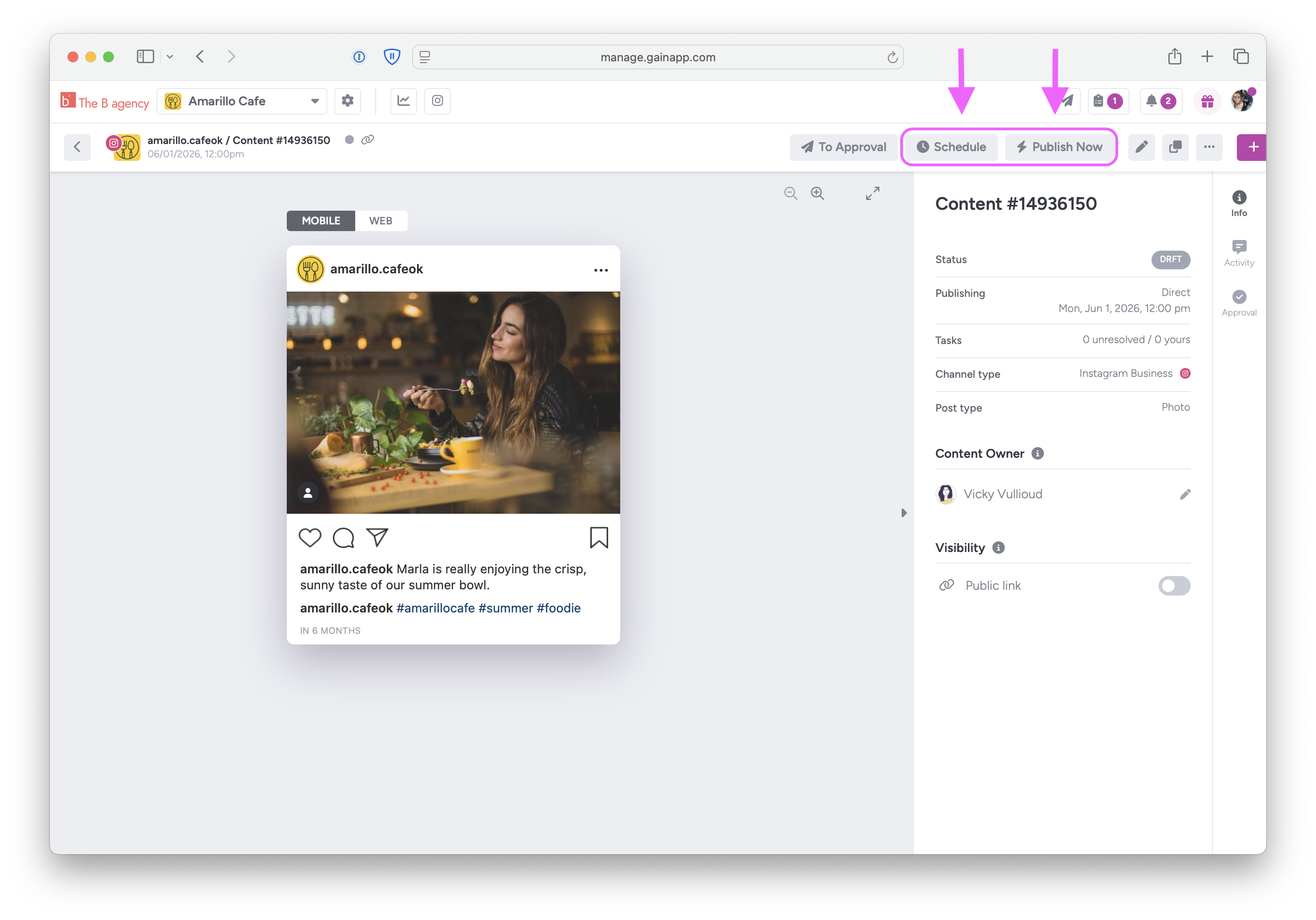 Once your content is approved, Gain auto-schedules and takes care of publishing for you. You can also schedule content by clicking on Schedule if you want to skip the approval process.