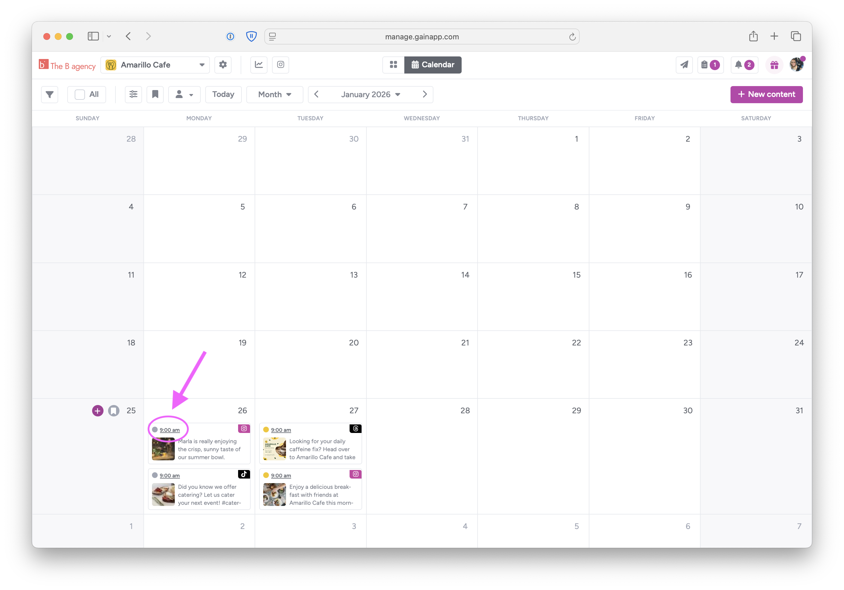 In Gain, your content progresses through different phases, including stages like Pending Approval and Scheduled. The colored circles on the calendar help you see the status of your posts at a glance. Visit this link to delve deeper into content management, custom views, and the content workflow.