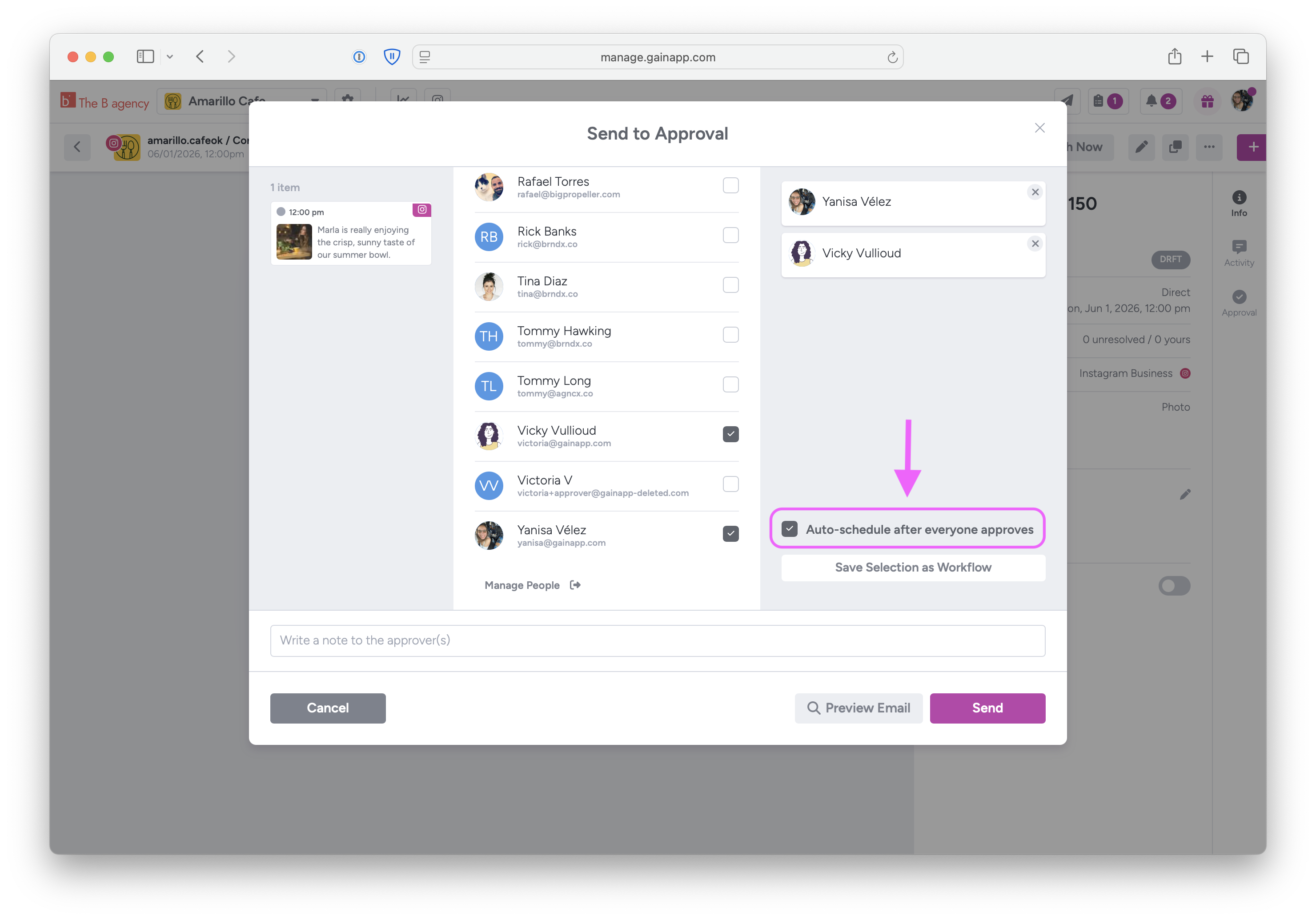 Gain can automatically schedule and publish your content once it's been approved by your stakeholder(s). When you create your approval workflow or choose the people you will send your content to, check the box to Auto-schedule after everyone approves.