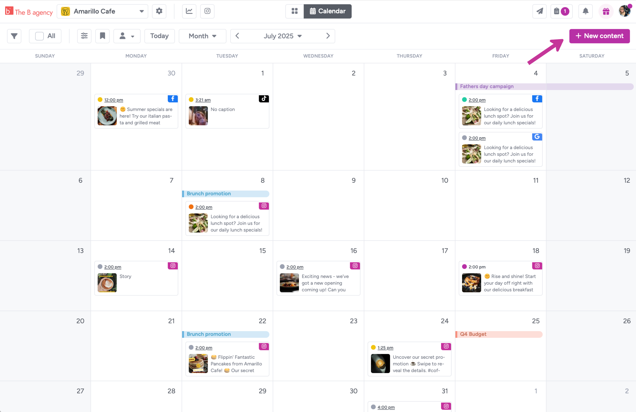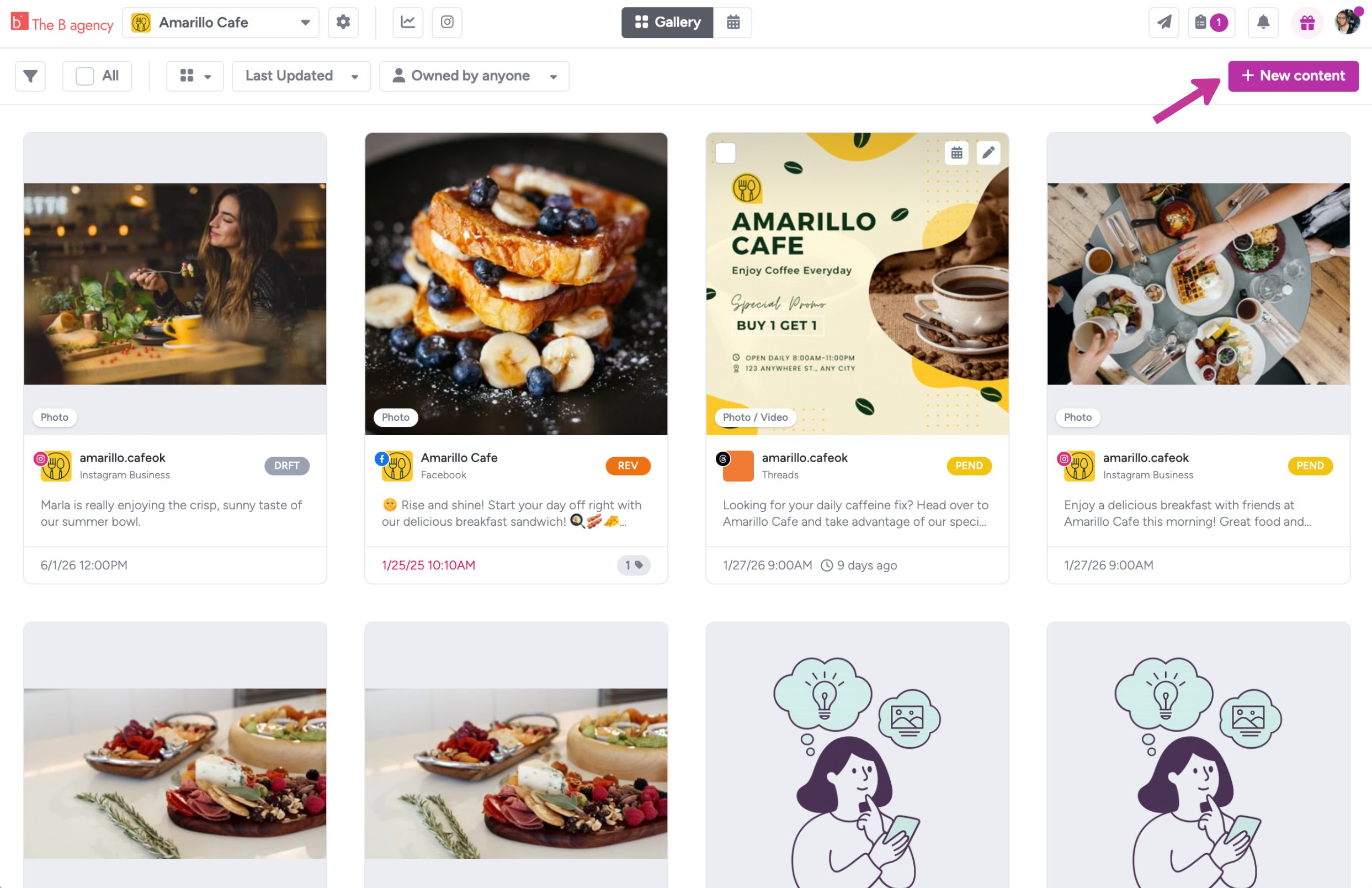You can create and schedule social posts and upload files from the Calendar view or the Gallery view by clicking + New Content at the upper right corner.