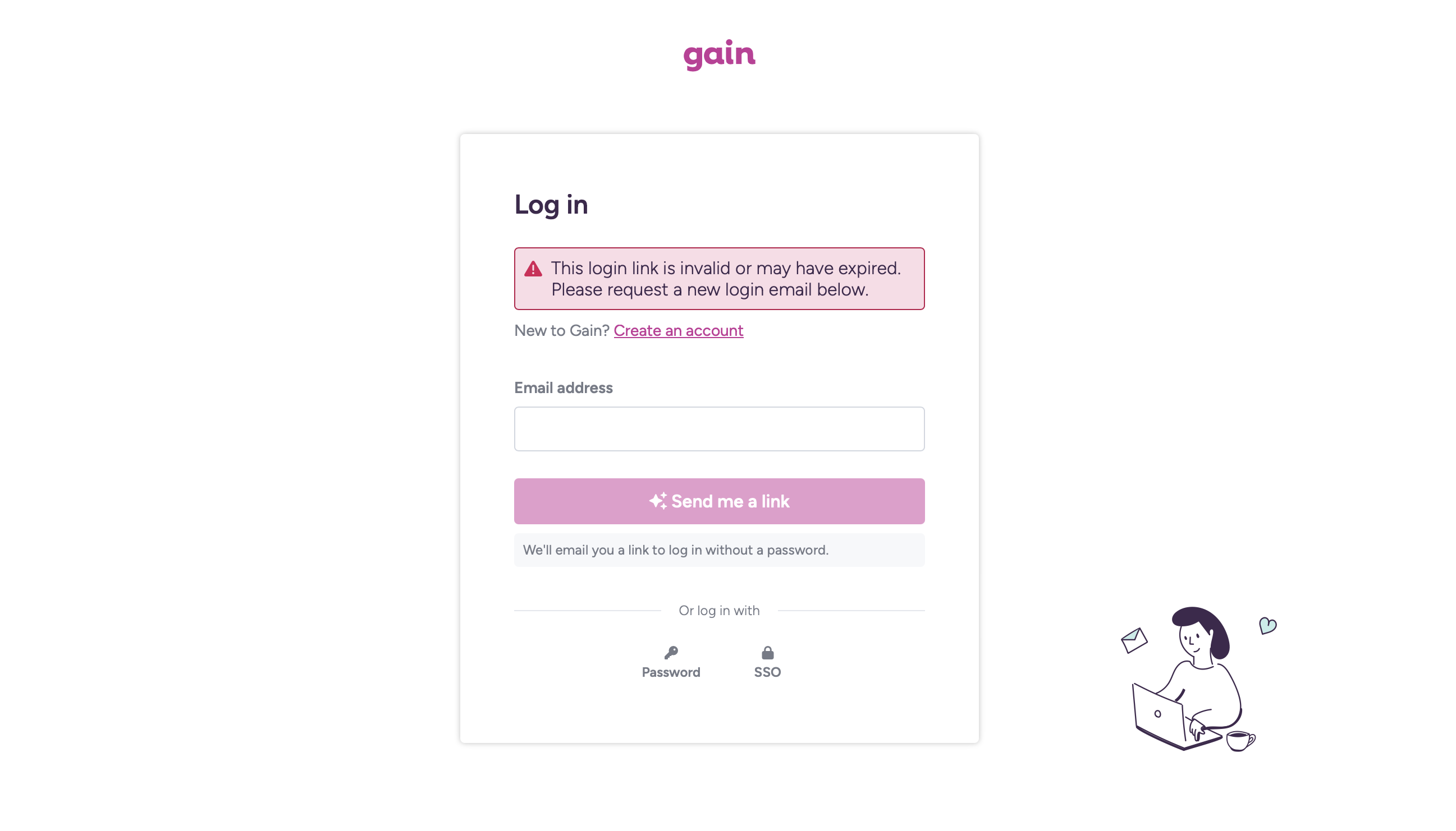 Each login link you receive via email contains a unique security token (we call it a magic token) that serves as a temporary, one-time password. The system authenticates the token, which Gain includes in the login URL, and logs the user into Gain without you having to enter a password.