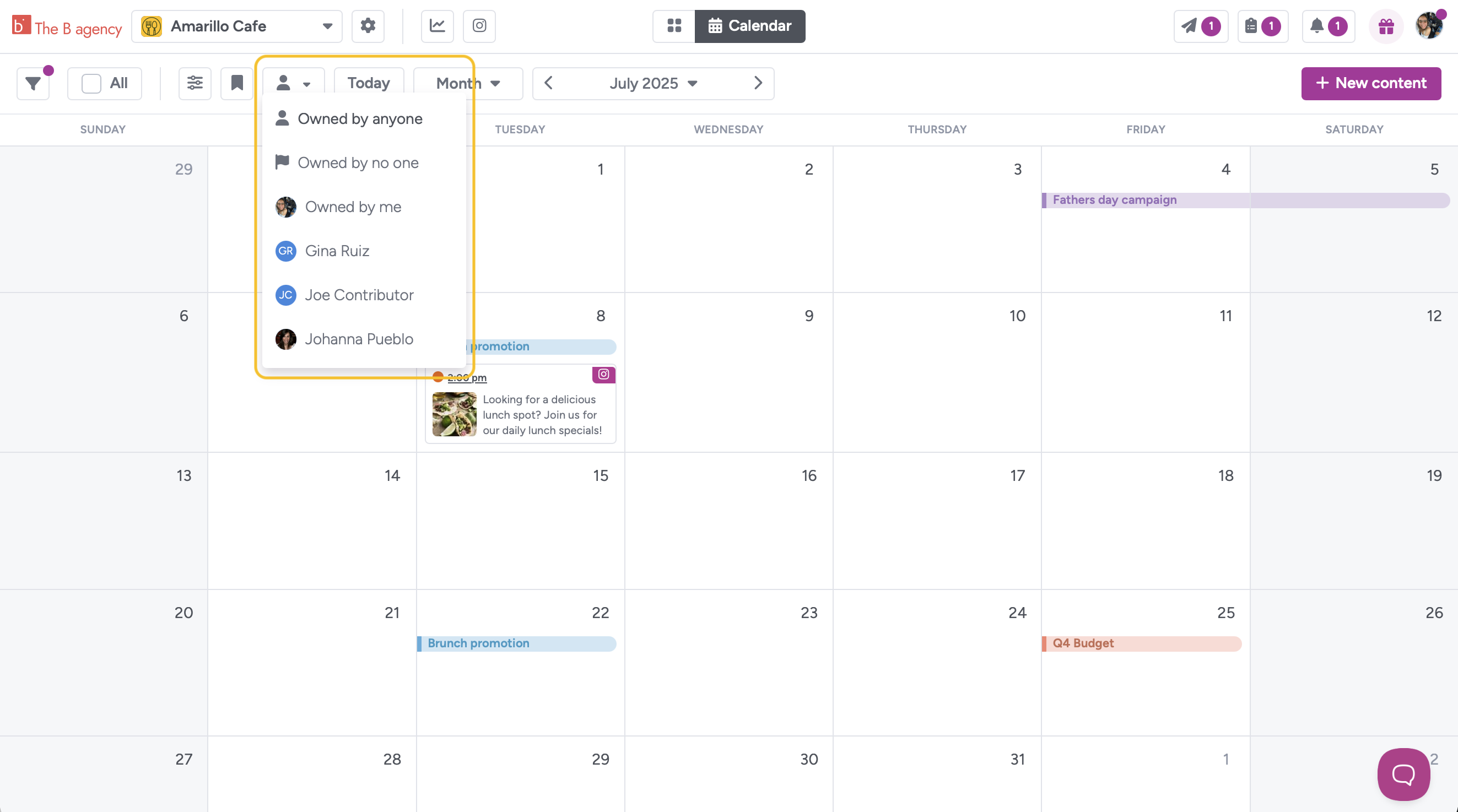 - Click the Content Owner button (person icon) on the top left of your Calendar or Gallery view.