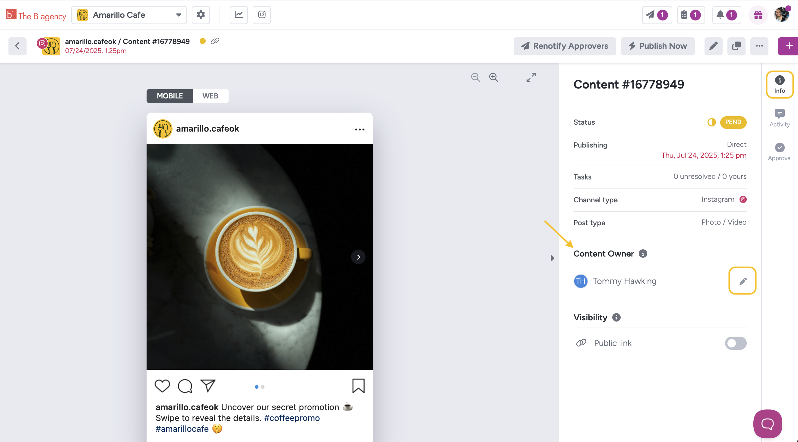 Account Owners, Admins, and Publishers can re-assign content to a different Team Member. You'll find this useful when a Team Member will be out. The new Content Owner will be notified via email and their in-app notifications (🔔).