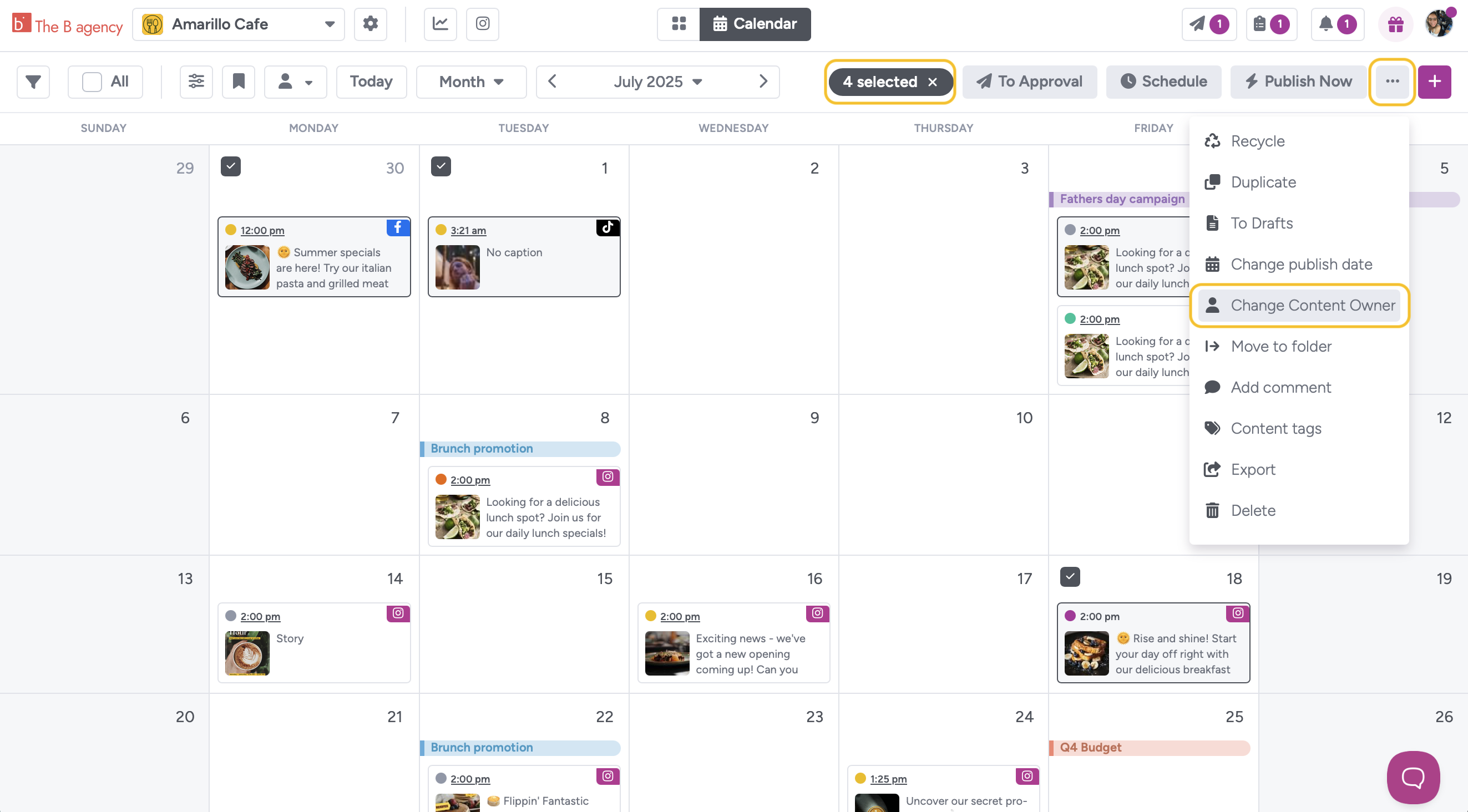 - From the Calendar or Gallery view, select the content items you want to reassign.
