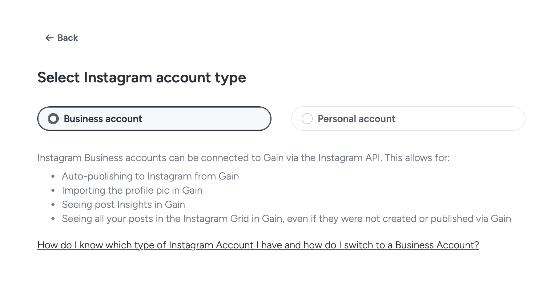Important: Gain will only publish to pages and Instagram accounts authorized by you, not your personal Facebook account.