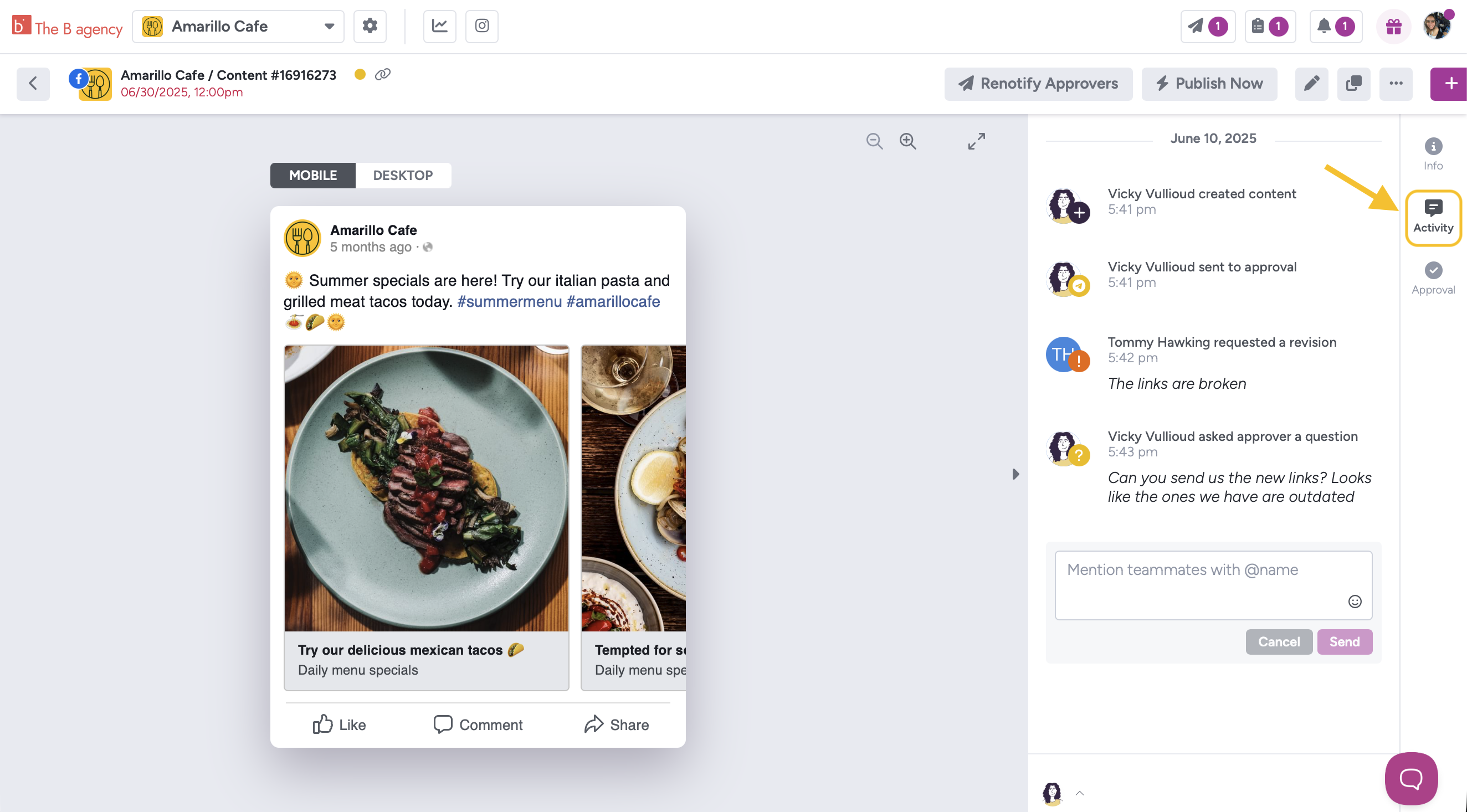 In the Activity tracker in each content item, you can see all the activity related to it, from who created the content item to Team Member comments and Client requests.