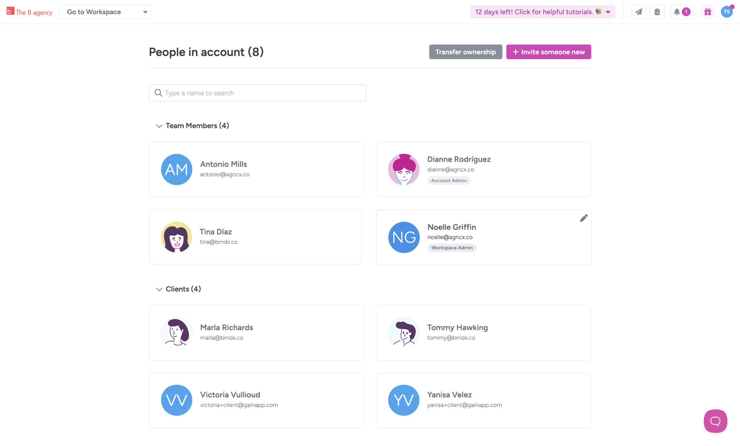 From the People in Account page, you can add or remove users, assign and change user roles, and transfer ownership of the account.