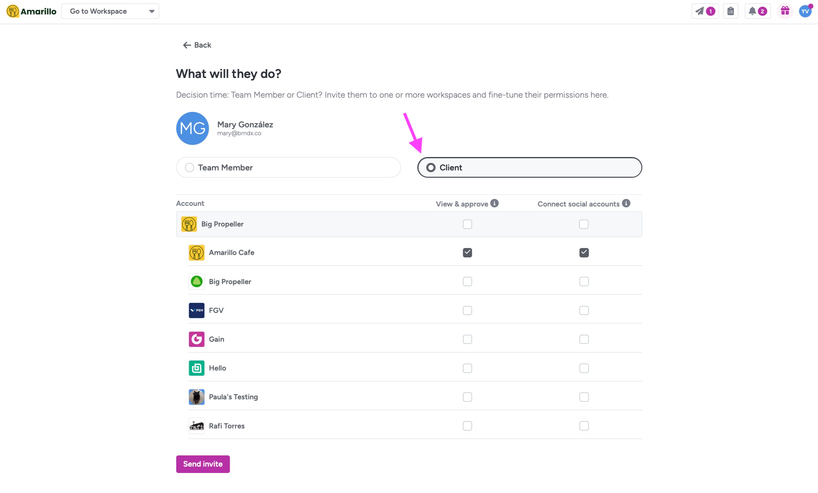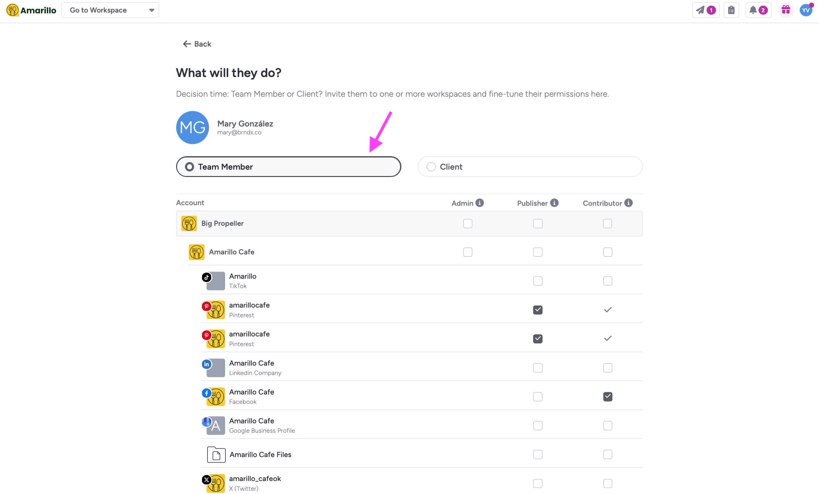 - Choose their role by clicking on either Team Member (Contributor, Publisher, Admin) or Client. You can assign their role at the account level if you want to give them access to all the workspaces in the account, or by workspace, only for the workspace(s) you want them to have access to.