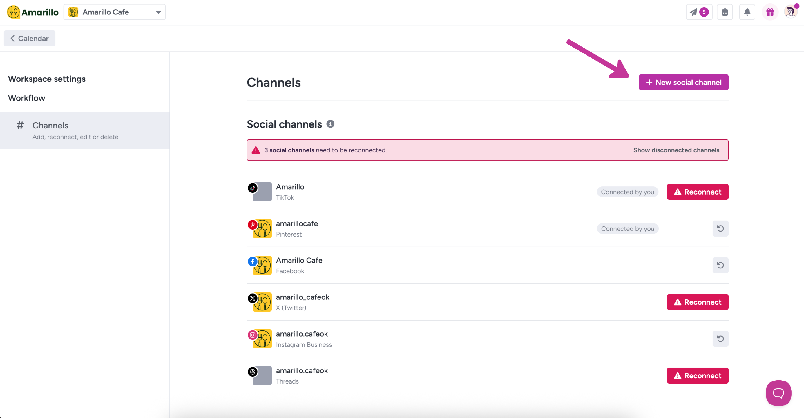 Your Client will receive an email notification and they'll have a new Workspace settings (⚙️) section in their calendar, where they'll be able to connect and reconnect social channels.